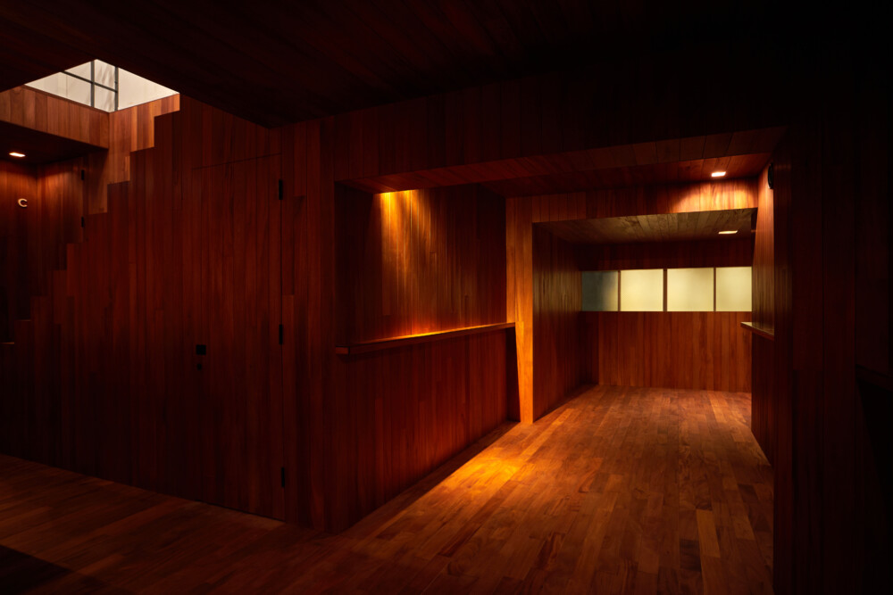 Fly Inc. フライ Text Info 大西健俊氏が率いる食と旅にまつわる編集会社Fly inc.のオフィス。 本格的なバーと撮影スタジオを併設し、イベントスペースとしても使用される。コンクリート造と木造が混ざり幾重にも増改築されてきた建物を改装した。既存躯体のもつ複雑性をいかし、蟻の巣のように凸凹としたひとつづきの空間をつくった。表面はすべて無垢のマホガニー材で仕上げた。 工事前の様子 1 2 3 4 所在地 東京都新宿区 施主 株式会社フライ 竣工 2022 用途 オフィス 照明設計 竹内俊雄 写真撮影 菅野祐二、橋本真美